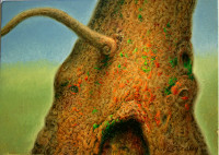 Standley’s world is inhabited equally by the living and the spirits of the dead, while the fossils are as alive as the plants and animals. The spiral is one of his favorite symbols for the slow constant change of evolution.